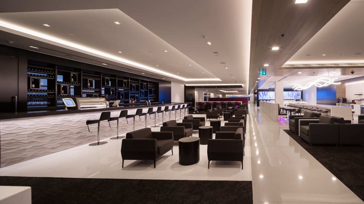 The Air New Zealand lounge is a spacious streamlined modern affair with a tended bar...