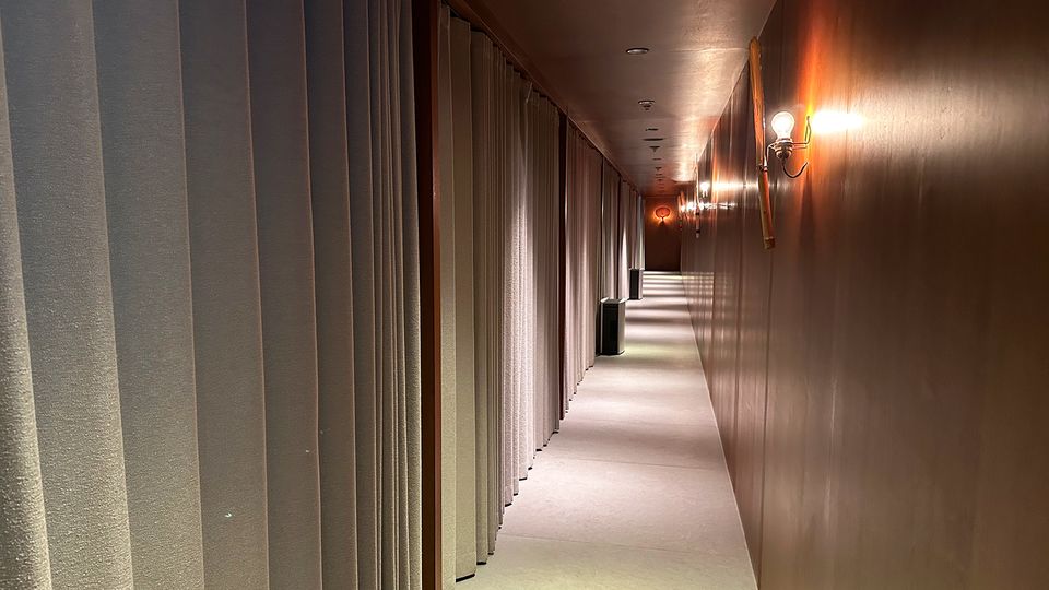Thick noise-reducing windows overlook adjacent airport gates and the runway, although you can lower the blinds and also draw the heavy aisle-facing drapes to cocoon yourself.