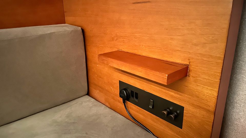 Secreted away in the quietest part of the lounge, each of these eight private nooks is furnished with a comfortable daybed, dimmable lighting, a ledge where you can park your carry-on bag and AC/USB ports so your travel tech can recharge at the same time as you do.
