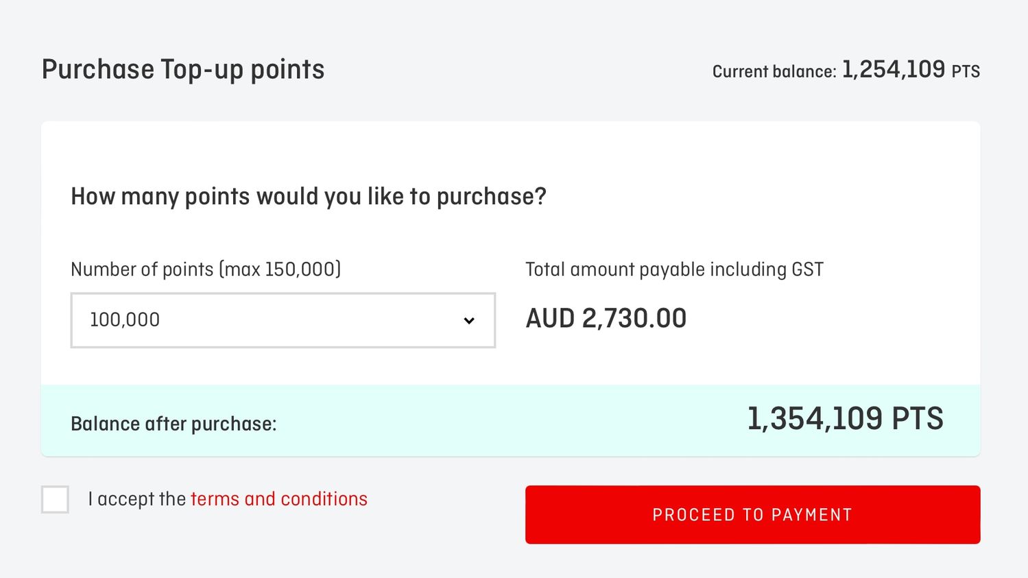 After logging in to your Qantas Frequent Flyer account, hover over the Points dropdown and click Top-up Points, then select the required number of points to see how much they’ll cost.