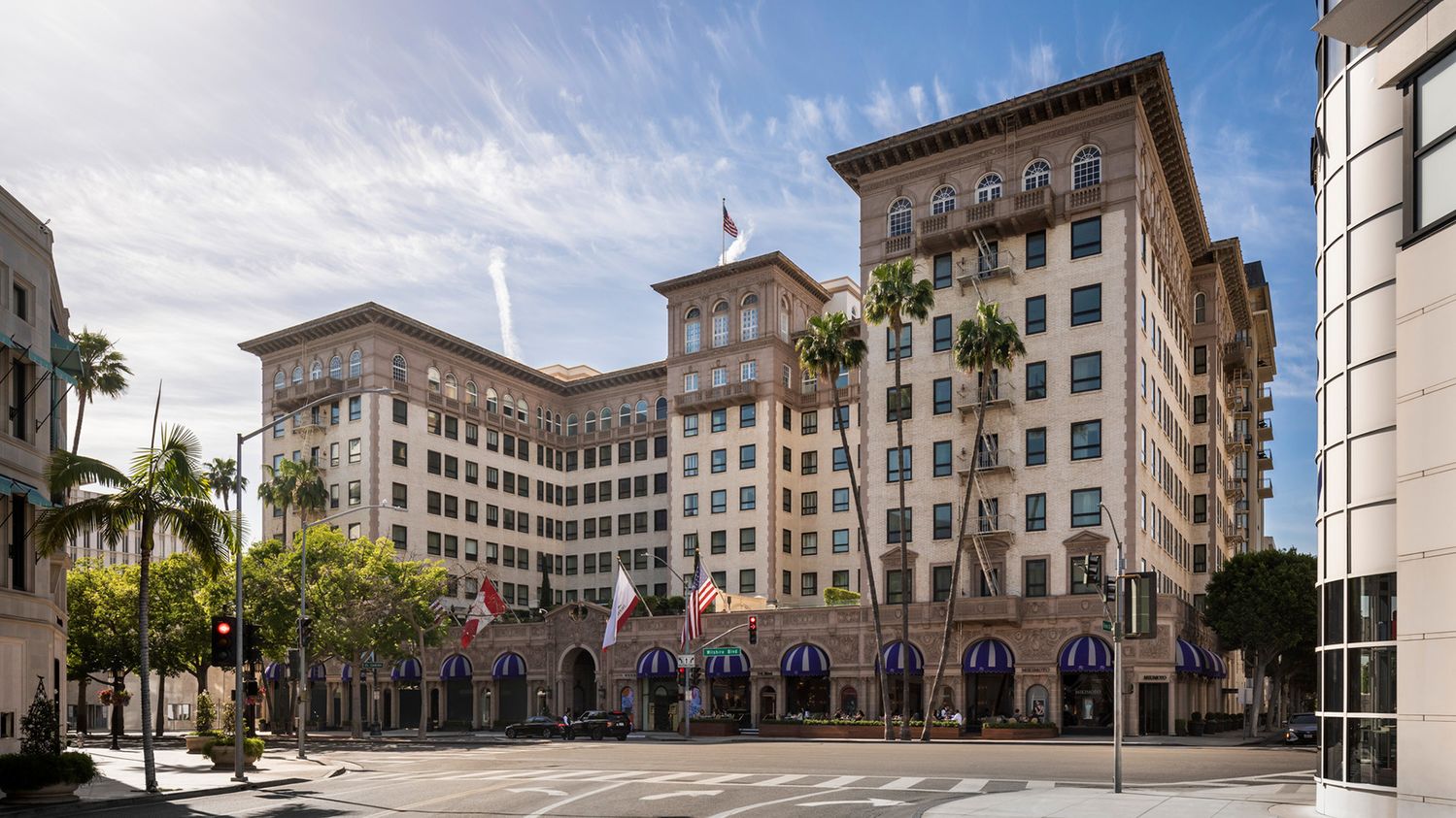 Taking its name from the intersection of Beverly Drive and Wilshire Boulevard on which it stands, the hotel is directly opposite a who’s who of fashion boutiques including Versace and Tiffany & Co.