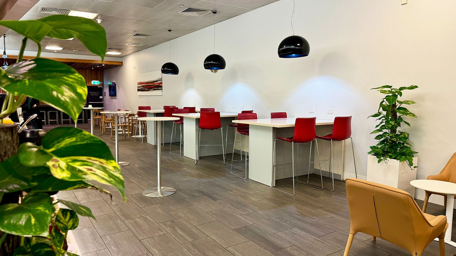 Upright dining tables and stools line the wall opposite (with plenty of power points too), book-ended by a handful of timber dining tables, chairs and low leather lounges.